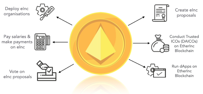 EtherInc или einc предназначены для создания уникального протокола для создания, управления и запуска децентрализованных приложений и организаций. Цель этого решения состоит в том, чтобы дать возможность предпринимателям во всем мире создавать и управлять децентрализованными фирмами, которые не имеют ограничений, дорогие посредники и распространяются через границы. Этот совместный подход поможет повысить ценность продуктов, а также повысить доверие и отказоустойчивость в компании. EtherInc намеревается быть доступным во всем мире для предпринимателей, где им нужна эта критическая услуга.